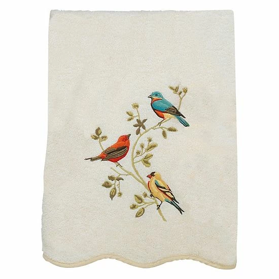 - Embroidered colorful birds, scalloped edge